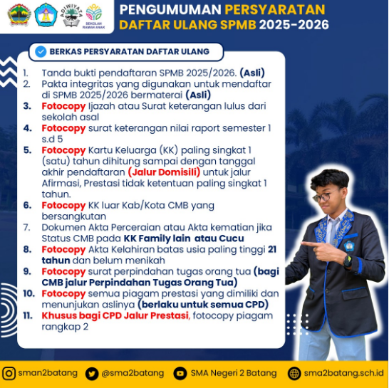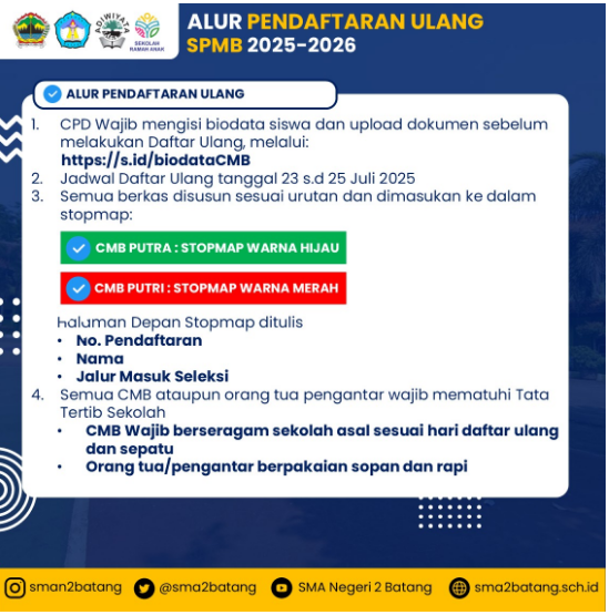 Pendaftaran ulang (daftar ulang) calon murid baru (CMB) SMA Negeri 2 Batang tahun ajaran 2025/2026 akan segera dilaksanakan. Calon murid yang dinyatakan diterima perlu melakukan daftar ulang dengan membawa persyaratan yang telah ditentukan. Informasi lebih lanjut mengenai jadwal dan persyaratan daftar ulang dapat dilihat di situs web atau media sosial SMA Negeri 2 Batang, serta situs resmi SPMB Jateng.